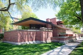 ロビー邸(フランク・ロイド・ライト)は、プレーリーハウス(草原住宅)の典型例とされ、緩やかな勾配屋根、深く突き出た軒先、横目地の強調された煉瓦の外壁等によって水平線を強調し、煙突の垂直線と対比させた住宅である。