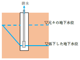 地面の中には思った以上に水が存在します。特に砂や礫(れき)の多い土壌では、掘るとすぐに水が湧き出てきてしまい、普通の掘削や建築工事が難しくなります。そこでディープウェル工法では深い井戸のような構造(=ディープウェル)を地中に設置し、ポンプで地下水をくみ上げて水位を下げることで、建築作業エリアをドライな状態に保つのです。施工管理技士の転職に特化〖施工管理求人ナビ〗