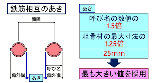 例えば、異形鉄筋を使用する場合、鉄筋同士のあきは「鉄筋の呼び名の数値の1.5倍」「粗骨材の最大寸法の1.25倍」「25mm」のうち最も大きな数値を基準に決められます。このように規定された寸法を守ることで、コンクリート打設時にしっかりと鉄筋が埋め込まれ、強度が保たれるのです。
