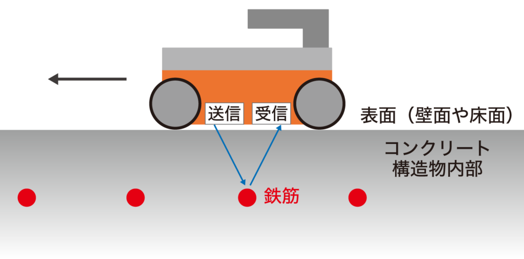 この方法では、探査機から電磁波をコンクリートに向けて送信し、内部で電気的性質の異なる物体(鉄筋や空洞)との境界で反射した波を受信します。その反射信号の解析から対象物の位置や深さを計算し、内部構造を把握できるのです。