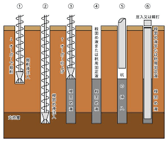 例えば、住宅やマンションを建てる前に地盤を掘削し、セメントミルクを注入しながら杭を埋めていきます。セメントミルクが土と一体化した部分が固まることで、地震や荷重に対して強い支持力を発揮します。コンクリートパイルだけではなく、地盤自体を強くする用途でも使われています。