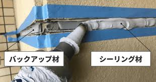 バックアップ材は、目地の奥に入れるクッション材で、シーリング材の性能を最大限発揮させるための重要な役割を担います。特に重要なのが、三面接着を防ぐことです。もし奥まで密着してしまうと、建物の動きに追従できず、ひび割れや剥離が発生します。バックアップ材を入れることで、適切な「二面接着」となり、柔軟性と耐久性が確保されます。