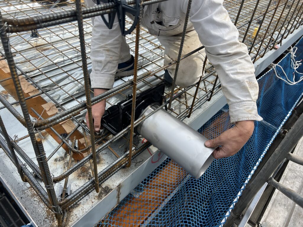 ③今日は屋上のデッキスラブの生コンクリート打設前に、ドレンの埋め込み作業を行った。普段何気なく見ている排水の設備も、こうして施工の段階に関わると、その重要性を強く感じた。特に、ドレンのパイプにしっかりノリがついているかを写真で記録する作業は、後から見えなくなる部分だからこそ確実に残しておく大切さを実感した瞬間だった。