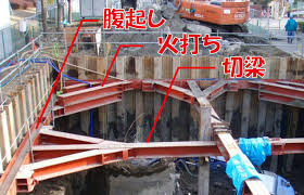 腹起しとは、山留め工事において矢板や親杭にかかる土圧・水圧を受け止め、切梁へ伝える水平材です。